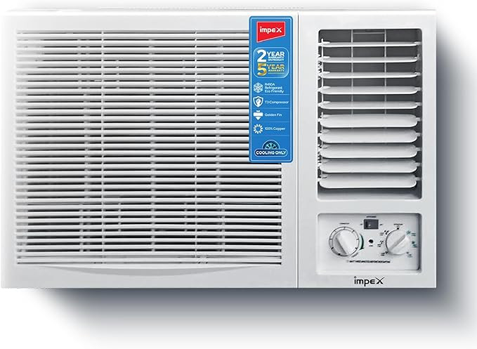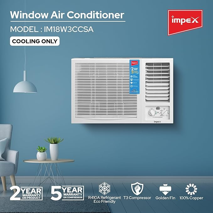 مكيف شباك سعة 1.5 طن 18000 وحدة حرارية بريطانية من امبيكس، نحاس 100% بتقنية الزعنفة الذهبية للتبريد فقط، مبرد صديق للبيئة R410A وضاغط، IM18W3CCSA